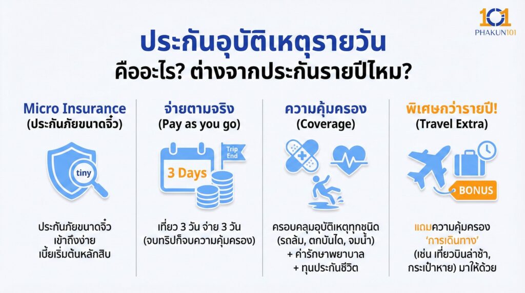 เข้าใจง่ายๆ มันคือ Micro Insurance หรือประกันภัยขนาดจิ๋ว ที่ย่อส่วนความคุ้มครองลงมาให้พอดีกับ “จำนวนวันเดินทาง” ของคุณครับ