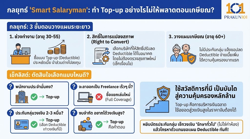 1. ช่วงทำงาน (อายุ 30-55): ซื้อแบบ Top-up (Deductible) ไปก่อน เพื่อประหยัดเงิน เอาส่วนต่างค่าเบี้ยไปลงทุนให้งอกเงย