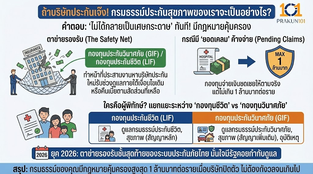 หากบริษัทประกันที่คุณถือกรมธรรม์อยู่ต้องปิดตัวลง กรมธรรม์ของคุณ “ไม่ได้กลายเป็นเศษกระดาษ” ทันที เพราะมีกฎหมายคุ้มครองผ่าน กองทุนประกันวินาศภัย (General Insurance Fund – GIF) หรือ กองทุนประกันชีวิต (Life Insurance Fund – LIF) แล้วแต่ประเภทบริษัท โดยกองทุนจะทำหน้าที่ประสานงานหาบริษัทประกันใหม่มารับช่วงดูแลกรมธรรม์ต่อภายใต้เงื่อนไขเดิม หรือคืนเบี้ยประกันตามสัดส่วนที่เหลือ แต่หากมี “ยอดเคลม” ค้างจ่าย กองทุนจะจ่ายเงินชดเชยให้ตามจริงแต่ ไม่เกิน 1 ล้านบาทต่อราย
