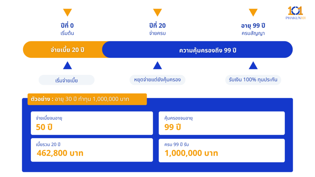 ตัวอย่าง: ทำอายุ 30 ปี → จ่ายเบี้ยถึงอายุ 50 ปี → หลังจากนั้น (50-99 ปี) ไม่ต้องจ่ายแต่ยังคุ้มครอง