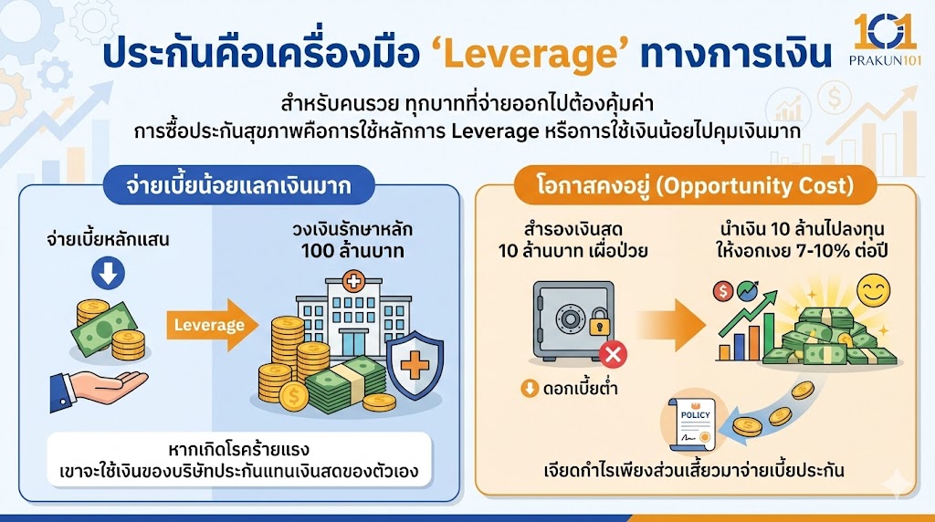 - โอกาสคงอยู่ (Opportunity Cost): แทนที่จะต้องสำรองเงินสด 10 ล้านบาทไว้เผื่อป่วย (ซึ่งได้ดอกเบี้ยต่ำ) เขาเอาเงิน 10 ล้านนั้นไปลงทุนให้งอกเงย 7-10% ต่อปี แล้วเจียดกำไรเพียงส่วนเสี้ยวมาจ่ายเบี้ยประกัน